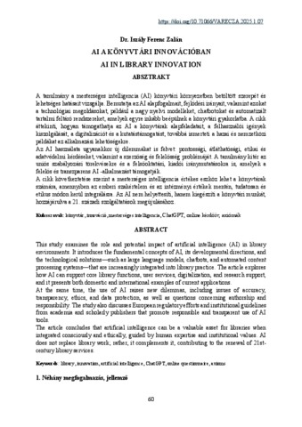 A tanulmány a mesterséges intelligencia (AI) könyvtári környezetben betöltött szerepét és lehetséges hatásait vizsgálja. Bemutatja az AI alapfogalmait, fejlődési irányait, valamint azokat a technológiai megoldásokat, például a nagy nyelvi modelleket, chatbotokat és automatizált tartalmi feltáró rendszereket, amelyek egyre inkább beépülnek a könyvtári gyakorlatba. A cikk áttekinti, hogyan támogathatja az AI a könyvtárak alapfeladatait, a felhasználói igények kiszolgálását, a digitalizációt és a kutatástámogatást, továbbá ismerteti a hazai és nemzetközi példákat az alkalmazási lehetőségekre. Az AI használata ugyanakkor új dilemmákat is felvet: pontossági, átláthatósági, etikai és adatvédelmi kérdéseket, valamint a szerzőség és felelősség problémáját. A tanulmány kitér az uniós szabályozási törekvésekre és a felsőoktatási, kiadói iránymutatásokra is, amelyek a felelős és transzparens AI -alkalmazást támogatják. A cikk következtetése szerint a mesterséges intelligencia értékes eszköz lehet a könyvtárak számára, amennyiben az emberi szakértelem és az intézményi értékek mentén, tudatosan és etikus módon kerül integrálásra. Az AI nem helyettesíti, hanem kiegészíti a könyvtári munkát, hozzájárulva a 21. századi szolgáltatások megújulásához. This study examines the role and potential impact of artificial intelligence (AI) in library environments. It introduces the fundamental concepts of AI, its developmental directions, and the technological solutions—such as large language models, chatbots, and automated content processing systems—that are increasingly integrated into library practice. The article explores how AI can support core library functions, user services, digitalization, and research support, and it presents both domestic and international examples of current applications. At the same time, the use of AI raises new dilemmas, including issues of accuracy, transparency, ethics, and data protection, as well as questions concerning authorship and responsibility. The study also discusses European regulatory efforts and institutional guidelines from academia and scholarly publishers that promote responsible and transparent use of AI tools. The article concludes that artificial intelligence can be a valuable asset for libraries when integrated consciously and ethically, guided by human expertise and institutional values. AI does not replace library work; rather, it complements it, contributing to the renewal of 21stcentury library services.