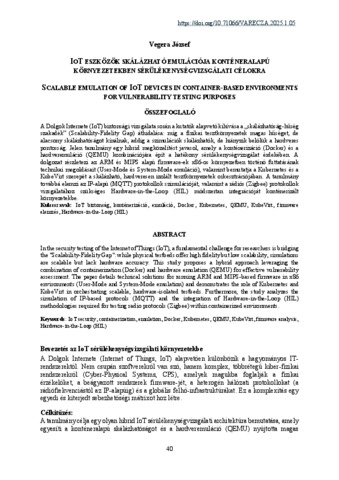 A Dolgok Internete (IoT) biztonsági vizsgálata során a kutatók alapvető kihívása a „skálázhatóság-hűség szakadék” (Scalability-Fidelity Gap) áthidalása: míg a fizikai tesztkörnyezetek magas hűséget, de alacsony skálázhatóságot kínálnak, addig a szimulációk skálázhatók, de hiányzik belőlük a hardveres pontosság. Jelen tanulmány egy hibrid megközelítést javasol, amely a konténerizáció (Docker) és a hardveremuláció (QEMU) kombinációjára épít a hatékony sérülékenységvizsgálat érdekében. A dolgozat részletezi az ARM és MIPS alapú firmware-ek x86-os környezetben történő futtatásának technikai megoldásait (User-Mode és System-Mode emuláció), valamint bemutatja a Kubernetes és a KubeVirt szerepét a skálázható, hardveresen izolált tesztkörnyezetek orkesztrációjában. A tanulmány továbbá elemzi az IP-alapú (MQTT) protokollok szimulációját, valamint a rádiós (Zigbee) protokollok vizsgálatához szükséges Hardware-in-the-Loop (HIL) módszertan integrációját konténerizált környezetekbe. In the security testing of the Internet of Things (IoT), a fundamental challenge for researchers is bridging the "Scalability-Fidelity Gap": while physical testbeds offer high fidelity but low scalability, simulations are scalable but lack hardware accuracy. This study proposes a hybrid approach leveraging the combination of containerization (Docker) and hardware emulation (QEMU) for effective vulnerability assessment. The paper details technical solutions for running ARM and MIPS-based firmware in x86 environments (User-Mode and System-Mode emulation) and demonstrates the role of Kubernetes and KubeVirt in orchestrating scalable, hardware-isolated testbeds. Furthermore, the study analyzes the simulation of IP-based protocols (MQTT) and the integration of Hardware-in-the-Loop (HIL) methodologies required for testing radio protocols (Zigbee) within containerized environments.