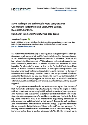 Shepard, Jonathan (2025) Slave Trading in the Early Middle Ages. Long-distance Connections in Northern and East Central Europe. By Janel M. Fontaine.: Manchester: Manchester University Press, 2025. 280 pp. HISTORICAL STUDIES ON CENTRAL EUROPE, 5 (2). pp. 304-308. ISSN 2786-0930
