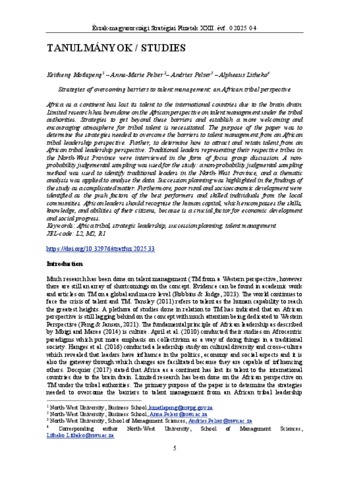 Motlapeng, Keitheng and Pelser, Anna-Marie and Pelser, Andries and Litheko, Alpheaus (2025) Strategies of Overcoming Barriers to Talent Management: An African Tribal Perspective. ÉSZAK-MAGYARORSZÁGI STRATÉGIAI FÜZETEK, 22 (04). pp. 5-19. ISSN 1786-1594