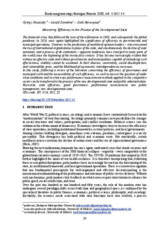 The financial crisis that followed the turn of the millennium in 2008, and subsequently the global pandemic in 2020, once again highlighted the significance of efficiency in governmental and municipal operations. Contrary to the predictions of neoliberal opinion leaders – who envisioned the rise of international organizations in place of the state, and simultaneously the decline of state autonomy and a process of de-statization – opposite tendencies have emerged in many parts of the world since the beginning of the twenty-first century. It has become increasingly evident that without an effective state and without governments and municipalities capable of embodying such effectiveness, stability cannot be sustained. In their absence, uncertainty, social dissatisfaction, and vulnerability grow, and the likelihood of asymmetric interdependencies increases.In this study, following a review of the literature concerning the efficiency of governance and municipal work and the measurability of such efficiency, we seek to answer the question of under what conditions and in what ways performance measurement methods applied in the competitive sector can be transferred to the practice of the new developmental state and public administration.