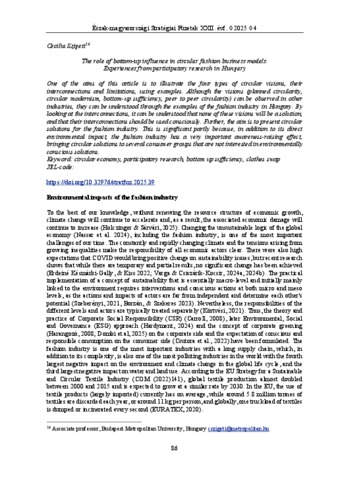 Szigeti, Cecilia (2025) The Role of Bottom-up Influence in Circular Fashion Business Models. Experiences from Participatory Research in Hungary. ÉSZAK-MAGYARORSZÁGI STRATÉGIAI FÜZETEK, 22 (04). pp. 86-96. ISSN 1786-1594