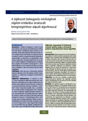 Beöthe, Tamás Zsolt (2025) A tájékozott beleegyezés minőségének objektív értékelése struktúrált betegmegértésen alapuló algoritmussal. Magyar Urológia, 2025 (4). pp. 163-168. ISSN 0864-8921