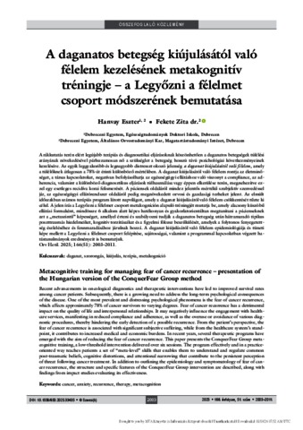 A rákkutatás terén elért legújabb terápiás és diagnosztikai eljárásoknak köszönhetően a daganatos betegségek túlélési arányának növekedésével párhuzamosan nő a szükséglet a betegség hosszú távú pszichológiai következményeinek kezelésére. Az egyik leggyakoribb és legnagyobb distresszt okozó jelenség a daganat kiújulásától való félelem, amely a túlélőknek átlagosan a 78%-át érinti különböző mértékben. A daganat kiújulásától való félelem rontja az életminőséget, a társas kapcsolatokat, negatívan befolyásolhatja az egészségügyi ellátáshoz való viszonyt a compliance, az adherencia, valamint a különböző diagnosztikus eljárások túlhasználása vagy éppen elkerülése terén, megnehezítve ezzel egy esetleges recidíva korai felismerését. A páciensek oldaláról mindez jelentős mértékű szubjektív szenvedéssel jár, az egészségügyi ellátórendszer oldaláról pedig megnövekedett orvosi és gazdasági terheket jelent. Az elmúlt időszakban számos terápiás program látott napvilágot, amely a daganat kiújulásától való félelem csökkentését tűzte ki célul. A jelen írás a Legyőzni a félelmet csoport metakogníción alapuló tréningjét mutatja be, amely alacsony küszöbű ellátási formaként, mindössze 6 alkalom alatt képes hatékonyan és gyakorlatorientáltan megtanítani a pácienseknek azt a „metaszintű” képességet, amellyel érteni és szabályozni tudják a daganatos betegség után hátramaradó tipikus poszttraumás hiedelmeiket, kognitív torzításaikat és a figyelmi fókusz beszűkülését, amelyek a folytonos fenyegetettség észleléséhez és fennmaradásához járulnak hozzá. A daganat kiújulásától való félelem epidemiológiája és tüneti képe mellett a Legyőzni a félelmet csoport felépítése, sajátosságai, valamint a programmal kapcsolatban végzett hatástanulmányok eredményeit is bemutatjuk. Orv Hetil. 2025; 166(51): 2003–2011. | Recent advancements in oncological diagnostics and therapeutic interventions have led to improved survival rates among cancer patients. Subsequently, there is a growing need to address the long-term psychological consequences of the disease. One of the most prevalent and distressing psychological phenomena is the fear of cancer recurrence, which affects approximately 78% of cancer survivors to varying degrees. Fear of cancer recurrence has a detrimental impact on the quality of life and interpersonal relationships. It may negatively influence the engagement with health- care services, manifesting in reduced compliance and adherence, as well as the overuse or avoidance of various diag- nostic procedures, thereby hindering the early detection of a possible recurrence. From the patient’s perspective, the fear of cancer recurrence is associated with significant subjective suffering, while from the healthcare system’s stand- point, it contributes to increased medical and economic burdens. In recent years, several therapeutic programs have emerged with the aim of reducing the fear of cancer recurrence. This paper presents the ConquerFear Group meta- cognitive training, a low-threshold intervention delivered over six sessions. The program effectively and in a practice- oriented way teaches patients a set of “meta-level” skills that enables them to understand and regulate common post-traumatic beliefs, cognitive distortions, and attentional narrowing that contribute to the persistent perception of threat following cancer treatment. In addition to outlining the epidemiology and symptomatology of fear of can- cer recurrence, the structure and specific features of the ConquerFear Group intervention are described, along with findings from impact studies evaluating its effectiveness.