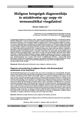 Az Egészségügyi Világszervezet felmérése szerint a daganatos megbetegedések világszerte a második helyen állnak a halálozási okok listáján. A tumorok eredményes kezelése és túlélése szempontjából továbbra is a még tünetmentes daganatok korai felismerése, a korai markerek megtalálása a legfontosabb cél. A humán vérminták vizsgálata ún. noninvazív módszer a daganatkutatás és a betegellátás során is. Napjainkban rutinszerűen a vérből bizonyos gének, géntermékek és tumormarkerek mérése alkalmas részben diagnosztizálásra, részben monitorozásra. Az emberi vérplazma proteomjának termoanalitikai vizsgálata az egyik ígéretes, új terület, amelynél a vérvételre mint folyékony biopsziára lehet tekinteni. A differenciális pásztázó kalorimetriás (DSC) vizsgálat közvetlenül méri a fehérje, lipid vagy nukleinsav stabilitását és felbomlását a minta hőmérsékletének növelése vagy csökkentése idején, lehetővé téve ezzel az egyes anyagok natív és denaturált állapotban való tanulmányozását. Az eredmény a DSC-görbe, egy biomolekula vagy biostruktúra egyedi, ujjlenyomatszerű termoanalitikai görbéje, amely tükrözi a normális vagy patomorfológiai változásokat adott körülmények között. A különböző klinikai kórképeknél (melanoma malignum, emlőtumor, pancreastumor) a betegek vérplazmáinak mérései során kapott egyedi, de a betegségre jellemző DSC-görbék összefüggést mutatnak a betegség súlyosságával, előrehaladottságával vagy a kezelésre adott válasszal. Továbbfejlesztését követően a vérplazma-DSC-görbék dekonvolúciós analízise felveti a lehetőségét a daganatos vagy gyulladásos kórképek korai diagnosztizálásának, a betegség monitorozásának vagy az alkalmazott terápia hatékonyságának egy csepp vérből való meghatározására. Orv Hetil. 2026 167(3): 98–108. | The World Health Organization’s survey indicates that cancer is the second leading cause of death globally. The identi- fication of early markers and the early detection of asymptomatic tumors remain the most critical objectives for effective treatment and improved survival. Human blood sample analysis is a noninvasive technique used in patient care and cancer research. Currently, certain genes, gene products and tumor markers measured in blood are routinely used for diagnosis and monitoring. The thermoanalytical examination of the human blood plasma proteome is a promising new area, where blood sampling can be considered a type of liquid biopsy. Differential scanning calorimetry (DSC) directly measures the stability and decomposition of proteins, lipids, or nucleic acids during a controlled increase or decrease in temperature, allowing the study of individual substances in their native and denatured states. This thermoanalytical DSC curve of a biomolecule or biostructure is unique, like a fingerprint, and shows normal or pathomorphological changes under specific circumstances. Various clinical conditions (malignant melanoma, breast tumor, pancreatic tumor) showed unique but disease-specific DSC thermograms obtained from measurements of patients’ blood plasma, which correlated with disease severity, progression, or response to treatment. Following further development, deconvolution analysis of blood plasma DSC curves raises the possibility of early diagnosis of cancerous or inflammatory conditions, disease monitoring, or testing the effectiveness of therapy used from a single drop of blood.