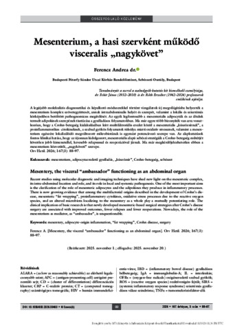 A legújabb molekuláris diagnosztikai és képalkotó módszerekkel történt vizsgálatok új megvilágításba helyezték a mesenterium komplex szövetegyüttesét, annak intraabdominalis helyét és szerepét, valamint a lokális és szisztémás kórképekben betöltött pathognomicus megítélését. Az egyik legfontosabb a mesenterialis adipocyták és az általuk termelt adipokinek szerepének tisztázása a gyulladásos folyamatokban. Ma már egyre több bizonyíték van arra vonatkozóan, hogy a Crohn-betegség kialakulásában leírt multifaktoriális eredet közül a mesenterialis „kúszózsírnak”, a proinflammatorikus citokineknek, a szabad gyökös folyamatok túlsúlya miatti oxidatív stressznek, valamint a mesenterium egészére lokalizálódó megváltozott mikrobiotának is egymást potencírozó szerepe van. Az alapkutatások fontos klinikai hatása, hogy az újonnan kidolgozott, mesenterialis alapú sebészi stratégiák a Crohn-betegség műtétjét követően jobb kimenetellel, kevesebb relapsussal és reoperációval járnak. Ma már megkérdőjelezhetetlen ebben a mesenterium közvetítői, „nagyköveti” szerepe. Orv Hetil. 2026; 167(3): 88–97. | Recent studies using molecular diagnostic and imaging techniques have shed new light on the mesenteric complex, its intra-abdominal location and role, and its role in local and systemic pathogenesis. One of the most important aims is the clarification of the role of mesenteric adipocytes and the adipokines they produce in inflammatory processes. There is now growing evidence that among the multifactorial origins described in the development of Crohn’s dis- ease, mesenteric “fat wrapping”, proinflammatory cytokines, oxidative stress processes due to the reactive oxygen species, and an altered microbiota localizing to the mesentery as a whole play a mutually potentiating role. The clinical implication of basic research is that newly developed mesenteric-based surgical strategies after Crohn’s disease surgery are associated with improved outcomes, fewer relapses and fewer reoperations. Nowadays, the role of the mesenterium as mediator, as “ambassador”, is unquestionable.