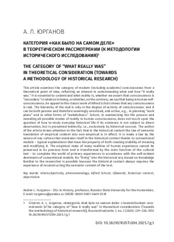 Yurganov, Andrei L. (2025) Категория «как было на самом деле» в теоретическом рассмотрении (к методологии исторического исследования) = The Category of “What Really Was” in Theoretical Consideration (Towards a Methodology of Historical Research). RUSSIANSTUDIES.HU, 7 (2). pp. 229-238. ISSN 2677-1640