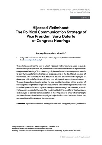 Audrey, Buenavista Morallo (2026) Hijacked Victimhood: The Political Communication Strategy of Vice President Sara Duterte in Congress Hearings. KOME: AN INTERNATIONAL JOURNAL OF PURE COMMUNICATION INQUIRY, 14 (1). pp. 1-20. ISSN 2063-7330