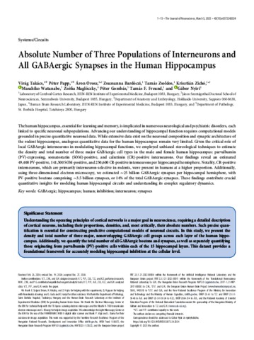 Tresóné Takács, Virág and Papp, Péter and Orosz, Áron and Bardóczi, Zsuzsanna and Zsoldos, Tamás and Zichó, Krisztián and Watanabe, Masahiko and Maglóczky, Zsófia and Gombás, Péter and Freund, Tamás and Nyiri, Gábor (2025) Absolute Number of Three Populations of Interneurons and All GABAergic Synapses in the Human Hippocampus. JOURNAL OF NEUROSCIENCE, 45 (10). No. e0372242024. ISSN 0270-6474