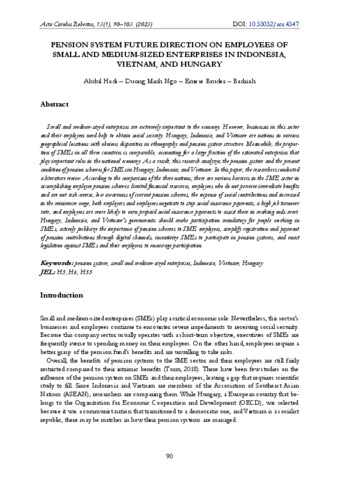 Hadi, Abdul and Ngo, Duong Minh and Bruder, Emese and Badriah, (2023) Pension System Future Direction on Employees of Small and Medium-sized Enterprises in Indonesia, Vietnam, and Hungary. ACTA CAROLUS ROBERTUS, 13 (1). pp. 90-103. ISSN 2062-8269 (nyomtatott); 2498-9312 (online)