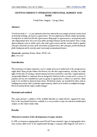 Pataki, Péter Gergely and Zörög, Zoltán (2023) Cryptocurrency Operating Principle, Market and Risks. ACTA CAROLUS ROBERTUS, 13 (1). pp. 62-75. ISSN 2062-8269 (nyomtatott); 2498-9312 (online)