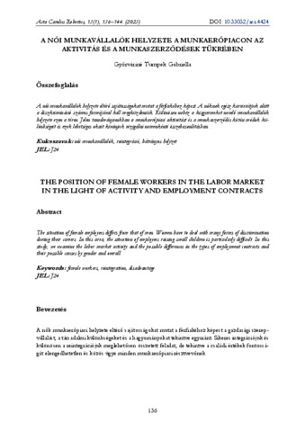 Győrváriné Tumpek, Gabriella (2023) A női munkavállalók helyzete a munkaerőpiacon az aktivitás és a munkaszerződések tükrében. ACTA CAROLUS ROBERTUS, 13 (1). pp. 136-144. ISSN 2062-8269 (nyomtatott); 2498-9312 (online)