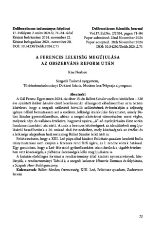 A Gál Ferenc Egyetemen 2024. október 15-én Bálint Sándor szellemi örökében – 120 éve született Bálint Sándor című konferencián elhangzott előadásomban arra tettem kísérletet, hogy a szegedi születésű hitvalló születésének évfordulóján a teljesség igénye nélkül bemutassam azt a szellemi, lelkiségi átalakulási folyamatot, amely Bálint Sándor gyermekkorában, abban a szeged-alsóvárosi városrészben ment végbe, melynek népi és vallásos értékeire, hagyományaira, „ö”-ző nyelvjárására élete során fundamentumként tekintett. Annak a ferences közösségnek az identitásbeli megújulásáról beszélhetünk a 20. század első évtizedeiben, mely közösségnek az értékei és a lelkisége alapjaiban határozta meg Bálint Sándor lelkületét is.Feltételezésem, hogy a XIII. Leó pápa által kiadott Felicitate quadam kezdetű bulla iránymutatásai nem csupán a ferences rend férfi ágára, az I. rendre voltak hatással. Úgy gondolom, hogy a Leó-féle unió gyümölcseként tekinthetünk a tágabb értelemben vett közösségek, a plébániai közösségek lelki megújulására is.A kutatás elsődleges forrásai a rendtartomány által kiadott nyomtatványok, közlönyök, a rendtartományi Tabulák, a szegedi kolostor Historia Domusa és folyóirata, a Szegedi Havi Boldogasszony. | In my presentation at the conference entitled In the Spiritual Heritage of Sándor Bálint – 120 Years Since the Birth of Sándor Bálint, held on 15 October 2024 at Gál Ferenc University, I attempted—without claiming completeness—to present the spiritual and devotional transformation that took place during the childhood of Sándor Bálint in the Szeged-Alsóváros district. This neighborhood, with its popular and religious values, traditions, and distinctive ‚ö’-dialect, remained a foundational reference point for Bálint throughout his life. We can speak of an identity-based renewal of the Franciscan community during the first decades of the 20th century— one whose values and spirituality fundamentally shaped the spiritual disposition of Sándor Bálint himself. I assume that the guidelines set out in the papal bull „Felicitate quadam”, issued by Pope Leo XIII, did not affect only the male branch of the Franciscan First Order. I believe that Leo’s union can also be seen as the starting point for a broader spiritual renewal that extended to parish communities in the wider sense. The primary sources of my research include the publications and circulars issued by the Franciscan province, the provincial Tabulae, the Historia Domus of the Szeged monastery, and its periodical, Szegedi Havi Boldogasszony.