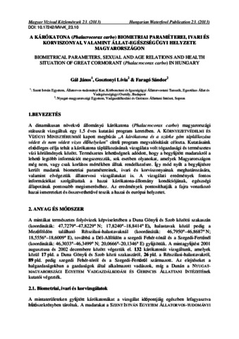 Gál, J and Gosztonyi, Lívia and Faragó, Sándor (2013) A kárókatona (Phalacrocorax carbo) biometriai paraméterei, ivari és korviszonyai, valamint állat-egészségügyi helyzete Magyarországon. MAGYAR VÍZIVAD KÖZLEMÉNYEK, 2013 (23). pp. 197-210. ISSN 1416-1389