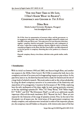 Busi, Dóra (2025) “For the First Time in My Life, I Don’t Know What to Believe” : Conspiracy and Gender in The X-Files. EGER JOURNAL OF ENGLISH STUDIES (25). pp. 81-99. ISSN 1786-5638 (print); 2060-9159 (online)