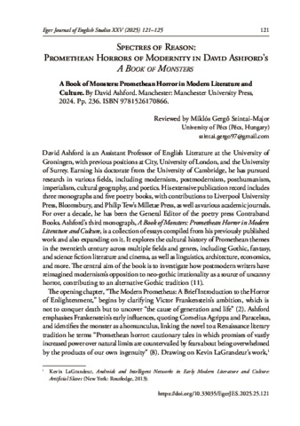 Szintai-Major, Miklós Gergő (2025) Spectres of Reason : Promethean Horrors of Modernity in David Ashford's A Book of Monsters. EGER JOURNAL OF ENGLISH STUDIES (25). pp. 121-125. ISSN 1786-5638 (print); 2060-9159 (online)