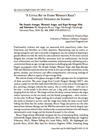 Papp, Fruzsina (2025) “A little bit of every woman’s rage” : Feminist Violence on Screen. EGER JOURNAL OF ENGLISH STUDIES (25). pp. 139-141. ISSN 1786-5638 (print); 2060-9159 (online)