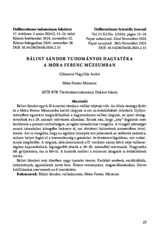 Glässerné Nagyillés, Anikó (2024) Bálint Sándor tudományos hagyatéka a Móra Ferenc Múzeumban = Sándor Bálint's scholarly legacy at the „Móra Ferenc" Museum. DELIBERATIONES, 17 (2). pp. 15-24. ISSN 1789-8919