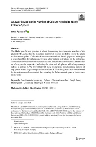 Ágoston, Péter (2025) A Lower Bound on the Number of Colours Needed to Nicely Colour a Sphere. DISCRETE AND COMPUTATIONAL GEOMETRY, 74. pp. 691-718. ISSN 0179-5376