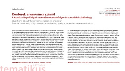 A művészet a fénnyel és színnel kapcsolatos fizikai és spirituális elképzeléseket, ismereteket és látszólagos paradoxonokat mindig igyekezett megfogalmazni a formák és színek nyelvén. A színnek a művészettörténetben évszázadokon át betöltött szimbolikus, ábrázoló, expresszív, de a témának alárendelt szerepei mellett vagy után, a színértékek a 19. század második felétől egyenrangú képalkotó erőkké váltak. A 20. században a szín és a festékanyag önálló jelentéseire, vagy az anyagtól felszabadított színre tevődött át a kérdéskör fókusza. Ez a folyamat a tudományos eredményektől nem függetlenül ment végbe. Mai elméleti és instrumentális tudásunk szerint a színek látásakor fizikai folyamatok hatására keletkeznek a színeket kiváltó ingerek, maguk a színek azonban a színpercepciós és idegrendszeri „hardver” és az agyi „szoftverek” működésének együttes eredményei. A színezet az elektromágneses mező fény tartományának mérhető hullámhosszától és frekvenciájától, valamint kvantumainak, a fotonoknak energiaszintjétől függő minőség, amit látásunkkal fiziológiai úton érzékelünk. Összetett információcsomag a látott szín, amelyet tudattalanul vagy tudatosítva, egyénenként is és pillanatonként is sokféleképpen értékelünk. A csomag egyik szála, a színvalóság eredője a fizikai, vagy kozmikus fény univerzumában keresendő, egy másik az anyagi világ mélyszövetében, egy harmadik a látószerv biológiai és kémiai felépítésében, egy negyedik a látó agyi és vizuális információfeldolgozó képességeiben, szellemi és érzelmi apparátusának kifinomultságában. Milyen információkat hordoznak a színek önmagukban és tér-forma-idő relációikban? Ilyen kérdésekkel foglalkozik a tanulmány a szín, az elméleti fizika és a kortárs művészet kapcsolatának legaktuálisabb kérdéseit érintve. | Art has always sought to formulate physical and spiritual ideas, knowledge, and apparent paradoxes related to light and color in the language of forms and colors. In addition to or following their symbolic, representational, and expressive roles subordinate to the subject matter, color values have become equal image-forming forces. In the 20th century, partly as a result of scientific results, the focus shifted to the independent meanings of color and paint, or to color liberated from matter. Stimuli that allow us to see colors arise through physical processes, yet the colors themselves are the combined results of the operation of color perception – hardware of the nervous system, and software of the brain. Color is a quality dependent on the measurable wavelength and frequency of the light range of the electromagnetic field, as well as the energy level of its quanta, the photons, which we perceive physiologically with our vision. Visible color is a complex information package: one strand of it originates in the universe of physical or cosmic light, another in the deep tissue of material world, a third in the biological and chemical structure of the visual organ, a fourth in the brain and visual information processing capabilities of the seer, and in the sophistication of their mental and emotional apparatus. What information do colors carry in themselves and in their space-form-time relations? The study deals with such questions, touching on the most current issues of the relationship between color, theoretical physics, and contemporary art.