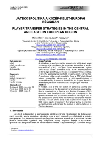 A futballban a sportszakmai és anyagi siker elérésének egyik kulcstényezője a hatékony játékospolitika kialakítása. A közép- kelet-európai (CEE) országok sportszervezeteinek sajátos kihívásokkal kellett szembenézniük, mivel alkalmazkodniuk kellett a régió specifikus gazdasági és társadalmi környezetéhez, valamint a gazdaságilag fejlettebb nyugati piacok elvárásaihoz. E tanulmány célja annak vizsgálata, hogy a CEE régió klubjai milyen stratégiákat alkalmaznak a játékospolitikájukban a versenyképesség fenntartása érdekében, és hogyan kezelik a tehetséges játékosok elvándorlását a nyugati ligák irányába. In football, one of the key factors in achieving sporting and financial success is the development of an effective player policy. Sports organisations in Central and Eastern European (CEE) countries have faced particular challenges in adapting to the specific economic and social environment of the region and to the expectations of the more economically developed Western markets. The aim of this study is to examine how clubs in the CEE region apply strategies in their player policy to maintain competitiveness and manage the exodus of talented players to Western leagues.