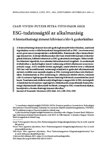 Csapi, Vivien and Putzer, Petra and Tóth-Pajor, Ákos (2025) ESG-tudatosságtól az alkalmazásig : A fenntarthatósági átmenet kihívásai a kkv-k gyakorlatában. KÖZGAZDASÁGI SZEMLE, 72 (9-10). pp. 875-899. ISSN 0023-4346 (print); 1588-113X (online)