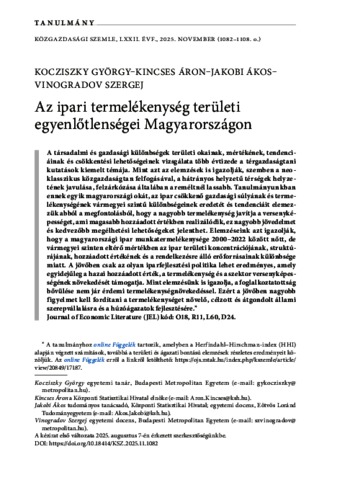 Kocziszky, György and Kincses, Áron and Jakobi, Ákos and Vinogradov, Szergej (2025) Az ipari termelékenység területi egyenlőtlenségei Magyarországon. KÖZGAZDASÁGI SZEMLE, 72 (11). pp. 1082-1108. ISSN 0023-4346 (print); 1588-113X (online)