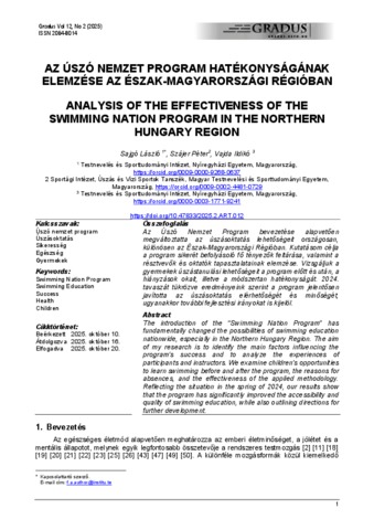 Az Úszó Nemzet Program bevezetése alapvetően megváltoztatta az úszásoktatás lehetőségeit országosan, különösen az Észak-Magyarországi Régióban. Kutatásom célja a program sikerét befolyásoló fő tényezők feltárása, valamint a résztvevők és oktatók tapasztalatainak elemzése. Vizsgáljuk a gyermekek úszástanulási lehetőségeit a program előtt és után, a hiányzások okait, illetve a módszertan hatékonyságát. 2024. tavaszát tükrözve eredményeink szerint a program jelentősen javította az úszásoktatás elérhetőségét és minőségét, ugyanakkor további fejlesztési irányokat is kijelöl. | The introduction of the “Swimming Nation Program” has fundamentally changed the possibilities of swimming education nationwide, especially in the Northern Hungary Region. The aim of my research is to identify the main factors influencing the program’s success and to analyze the experiences of participants and instructors. We examine children’s opportunities to learn swimming before and after the program, the reasons for absences, and the effectiveness of the applied methodology. Reflecting the situation in the spring of 2024, our results show that the program has significantly improved the accessibility and quality of swimming education, while also outlining directions for further development.