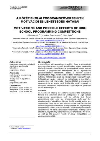 Pásztor, Attila and Szerémi, Éva Krisztina and Török, Erika (2025) A középiskolai programozóversenyek motivációi és lehetséges hatásai = Motivations and possible effects of high school programming competition. GRADUS, 12 (2). ISSN 2064-8014