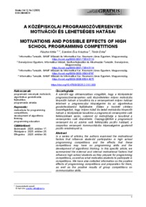 A szerzők egy cikksorozatban vizsgálták, hogy a középiskolai programozóversenyeken való részvételeken milyen motivációs tényezők hatnak a tanulókra és a versenyeknek milyen hatásai lehetnek a programozási készségekre és az algoritmikus gondolkodásmód fejlődésére. Ebben a konkrét cikkben összefoglaltuk, hogy milyen külső és belső motivációs tényezők hatnak a középiskolai tanulókra a programozó versenyekre való felkészülések során, valamint mi motiválhatja a tanulókat a versenyeken való részvételre. Összegyűjtöttük a programozó versenyek és az azokra való felkészülés pozitív hatásait, a csoportos versenyek kommunikációs képességekre gyakorolt pozitív eredményeit is. | In a series of articles, the authors examined the motivational factors that influence students' participation in high school programming competitions and the effects that these competitions may have on programming skills and the development of algorithmic thinking. In this specific article, we summarized the external and internal motivational factors that influence high school students as they prepare for programming competitions, as well as what motivates students to participate in competitions. We have also collected information on the positive effects of programming competitions and preparation for them, as well as the positive results of group competitions on communication skills.