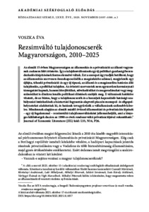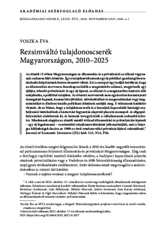 Voszka, Éva (2025) Rezsimváltó tulajdonoscserék Magyarországon, 2010–2025. KÖZGAZDASÁGI SZEMLE, 72 (11). pp. 1057-1081. ISSN 0023-4346 (print); 1588-113X (online)