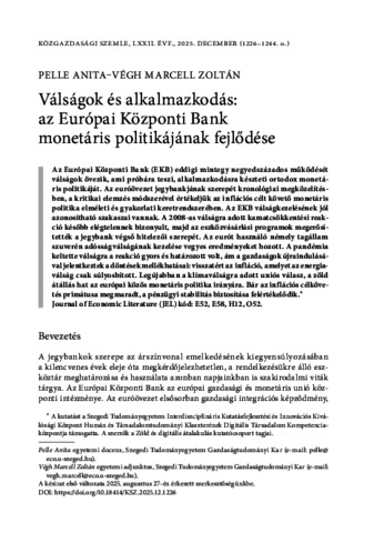 Pelle, Anita and Végh, Marcell Zoltán (2025) Válságok és alkalmazkodás: az Európai Központi Bank monetáris politikájának fejlődése. KÖZGAZDASÁGI SZEMLE, 72 (12). pp. 1226-1244. ISSN 0023-4346 (print); 1588-113X (online)