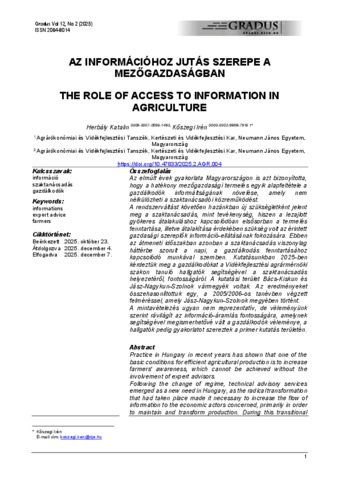Herbály, Katalin and Kőszegi, Irén Rita (2025) Az információhoz jutás szerepe a mezőgazdaságban = The role of access to information in agriculture. GRADUS, 12 (2). ISSN 2064-8014