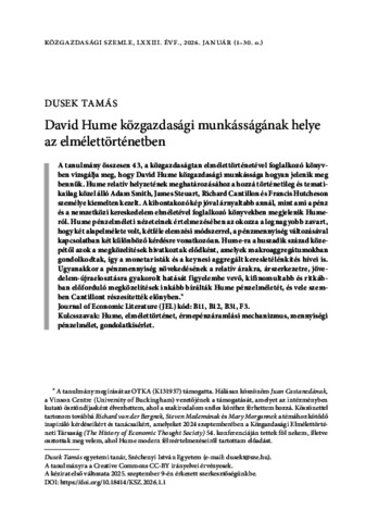 Dusek, Tamás (2026) David Hume közgazdasági munkásságának helye az elmélettörténetben. KÖZGAZDASÁGI SZEMLE, 73 (1). pp. 1-30. ISSN 0023-4346 (print); 1588-113X (online)