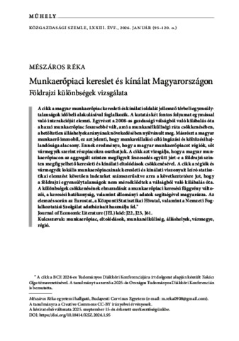 Mészáros, Réka (2026) Munkaerőpiaci kereslet és kínálat Magyarországon : Földrajzi különbségek vizsgálata. KÖZGAZDASÁGI SZEMLE, 73 (1). pp. 95-120. ISSN 0023-4346 (print); 1588-113X (online)