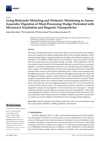 Jákói, Zoltán Péter and Illés, Erzsébet and Dobozi, Réka and Beszédes, Sándor (2026) Using Biokinetic Modeling and Dielectric Monitoring to Assess Anaerobic Digestion of Meat-Processing Sludge Pretreated with Microwave Irradiation and Magnetic Nanoparticles. WATER, 18 (3). No. 293. ISSN 2073-4441