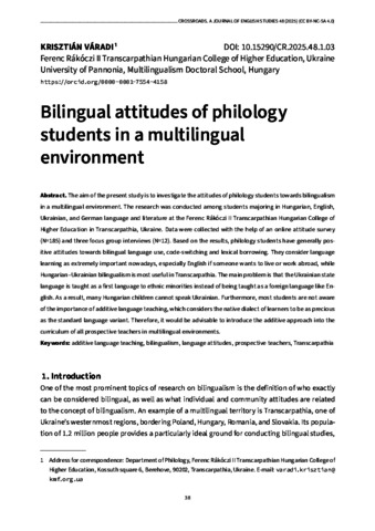 Váradi, Krisztián (2025) Bilingual attitudes of philology students in a multilingual environment. CROSSROADS A JOURNAL OF ENGLISH STUDIES, 48 (1). pp. 38-65. ISSN 23006250