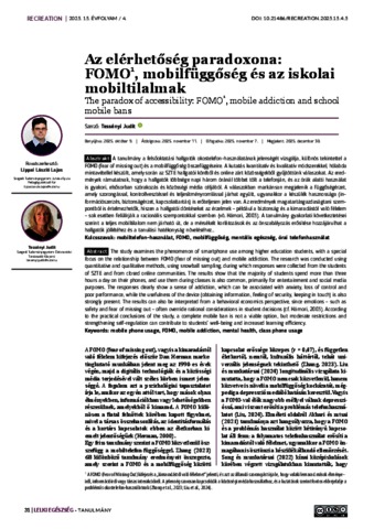 Tessényi, Judit (2025) Az elérhetőség paradoxona: FOMO, mobilfüggőség és az iskolai mobiltilalmak = The paradox of accessibility: FOMO, mobile addiction and school mobile bans. recreation, 15 (4). pp. 31-35. ISSN 2064-4981