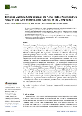 Yazdani, Morteza and Paróczai, Dóra and Barta, Anita and Burián, Katalin and Hohmann, Judit (2026) Exploring Chemical Composition of the Aerial Parts of Vernoniastrum migeodii and Anti-Inflammatory Activity of the Compounds. PLANTS-BASEL, 15 (2). No. 321. ISSN 2223-7747