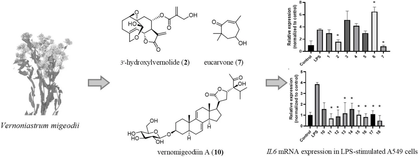 Therapeutic strategies that fine-tune epithelial inflammatory responses are highly sought after in respiratory and mucosal disorders, but few molecules selectively target these pathways. Vernoniastrum migeodii (S. Moore) Isawumi (Asteraceae) represents a chemically promising but understudied source of bioactive small molecules. This study aimed to define the metabolite profile of V. migeodii and evaluate the modulation of inflammatory epithelial signaling of the constituents. From the methanolic extract of V. migeodii, five germacranolide sesquiterpenes, vernolide (1), 3′-hydroxylvernolide (2), pectorolide (3), 4′-hydroxypectorolide-14-O-acetate (4) and 4′-hydroxypectorolide (5), together with (6S,9R)-vomifoliol (6), eucarvone (7), luteolin (8), and luteolin-7-O-glucoside (9) were isolated by multiple chromatographic separations. The structures were determined by comprehensive 1D and 2D NMR spectroscopy. Isolated compounds 1 to 9 together with previously reported steroids (10–17) and tripeptide (18) were evaluated in LPS-activated A549 cells by quantitative PCR for interleukin-6 (IL6), interleukin-1β (IL1β), and prostaglandin-endoperoxide synthase 2 (PTGS2) and by enzyme-linked immunosorbent assay (ELISA) for IL-6 and IL-8. Compounds 2, 7, steroids 10–17 and aurantiamide acetate (18) reduced IL6 mRNA relative to the LPS control, while (6S,9R)-vomifoliol (6) increased IL-6 and elevated IL-8. In the assay IL1β and PTGS2 transcripts were not significantly altered. These findings highlight the potential of V. migeodii metabolites as modulators of epithelial inflammatory pathways. Combining chemical and biological evidence provides a clear basis for structure–activity- and pathway-focused studies.