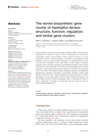 Németh Z., Márk and Csíkos, Sándor and Kovács, M. Gábor (2026) The terrein biosynthetic gene cluster of Aspergillus terreus: structure, function, regulation, and similar gene clusters. FRONTIERS IN FUNGAL BIOLOGY, 6. ISSN 2673-6128