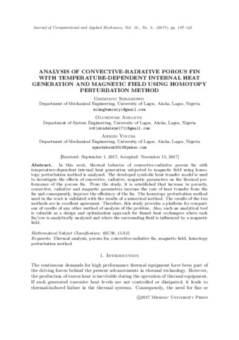 | Uncontrolled Keywords: | thermal analysis, porous fin, convective-radiative fin, magnetic field, homotopy perturbation method |
