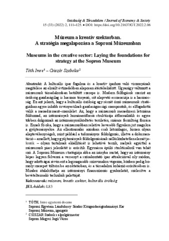 Tóth, Imre and Csiszár, Szabolcs János (2023) Múzeum a kreatív szektorban. A stratégia megalapozása a Soproni Múzeumban = Museums in the creative sector: Laying the foundations for strategy at the Sopron Museum. GAZDASÁG ÉS TÁRSADALOM, 15 (2). pp. 111-125. ISSN 0865-7823