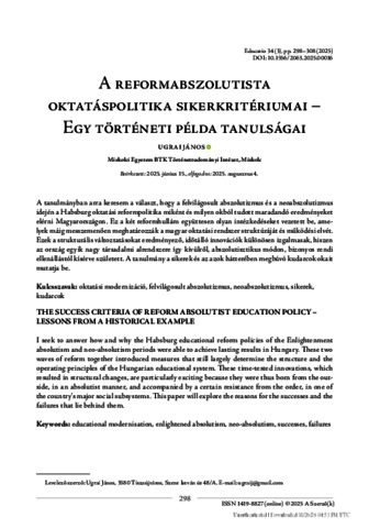 Ugrai, János (2026) A reformabszolutista oktatáspolitika sikerkritériumai – Egy történeti példa tanulságai. EDUCATIO, 34 (3). pp. 298-308. ISSN 1216-3384