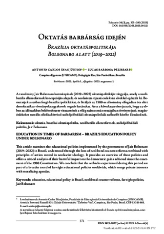 Dias, Antonio Carlos and Barbosa Pelissari, Lucas (2026) Oktatás barbárság idején : Brazília oktatáspolitikája Bolsonaro alatt (2019–2022) = Education in Times of Barbarism : Brazil’s Education Policy under Bolsonaro. EDUCATIO, 34 (3). pp. 371-380. ISSN 1216-3384
