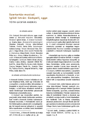 Tóth, Gáspár András (2025) Szertartás-musical : Iglódi István: Godspell, 1990 = A Musical Ritual. István Iglódi: Godspell, 1990. THEATRON: SZÍNHÁZTUDOMÁNYI PERIODIKA, 19 (2). pp. 80-92. ISSN 1418-9941