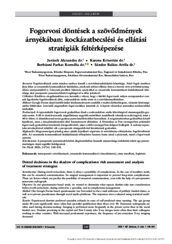 Jurásek, Alexandra and Katona, Krisztián and Borbásné Farkas, Kornélia and Sándor, Balázs Attila (2026) Fogorvosi döntések a szövődmények árnyékában: kockázatbecslési és ellátási stratégiák feltérképezése = Dental decisions in the shadow of complications: risk assessment and analysis of treatment strategies. ORVOSI HETILAP, 167 (4). pp. 148-155. ISSN 0030-6002