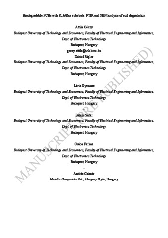 Géczy, Attila and Gyenizsei, Lívia and Farkas, Csaba and Rigler, Dániel and Sáfár, Balázs and Csiszár, András (2024) Biodegradable PCBs with PLA/Flax Substrate: FTIR and SEM Analysis of Soil Degradation. In: 2024 IEEE 10th Electronics System-Integration Technology Conference (ESTC), Berlin, Germany.
