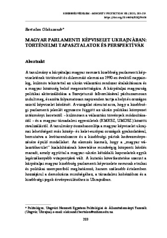 Bertalan, Olekszandr (2025) Magyar parlamenti képviselet Ukrajnában: Történelmi tapasztalatok és perspektívák. KISEBBSÉGVÉDELEM, 12. pp. 203-219. ISSN 2676-8992