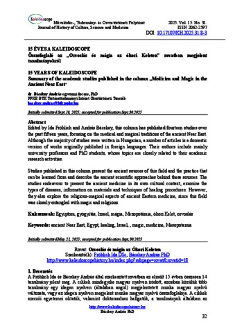 Bácskay, András (2025) Összefoglaló az „Orvoslás és mágia az ókori Keleten” rovatban megjelent tanulmányokról. KALEIDOSCOPE: MŰVELŐDÉS- TUDOMÁNY- ÉS ORVOSTÖRTÉNETI FOLYÓIRAT, 15 (31). pp. 32-35. ISSN 2062-2597